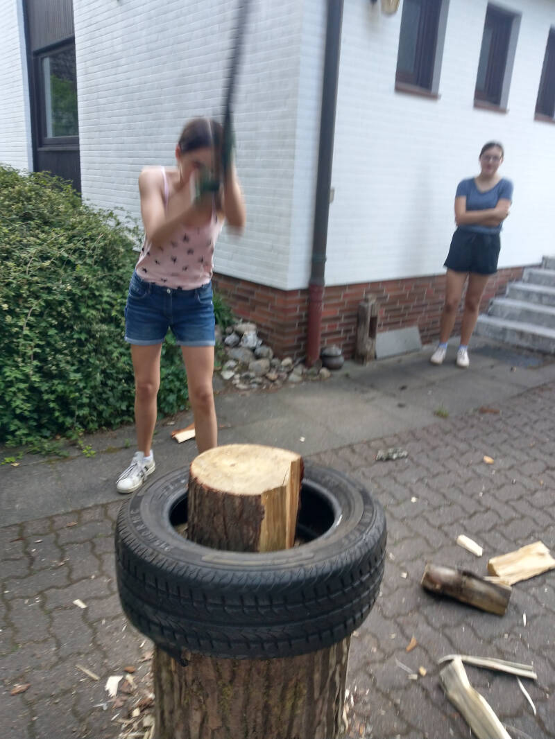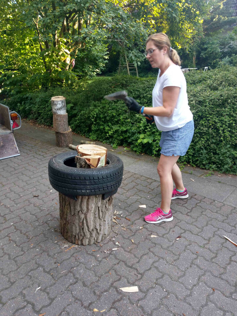 Die axtbar musste Lernen, das ein Spaltblock nicht reicht und so wird in Zukunft für weitere passenden Unterlagen gesorgt sein. Nach gut zwei Stunden ist das Holz gebrochen, die Treffsicherheit überall gegeben und auch die erste Blase macht sich an der Hand bemerkbar. Genug Schweiß ist geflossen, geschuldet dem warmen Wetter und weil Holz 3x warm macht, wie alle wissen: Beim Fallen, beim Axten und beim Brennen.