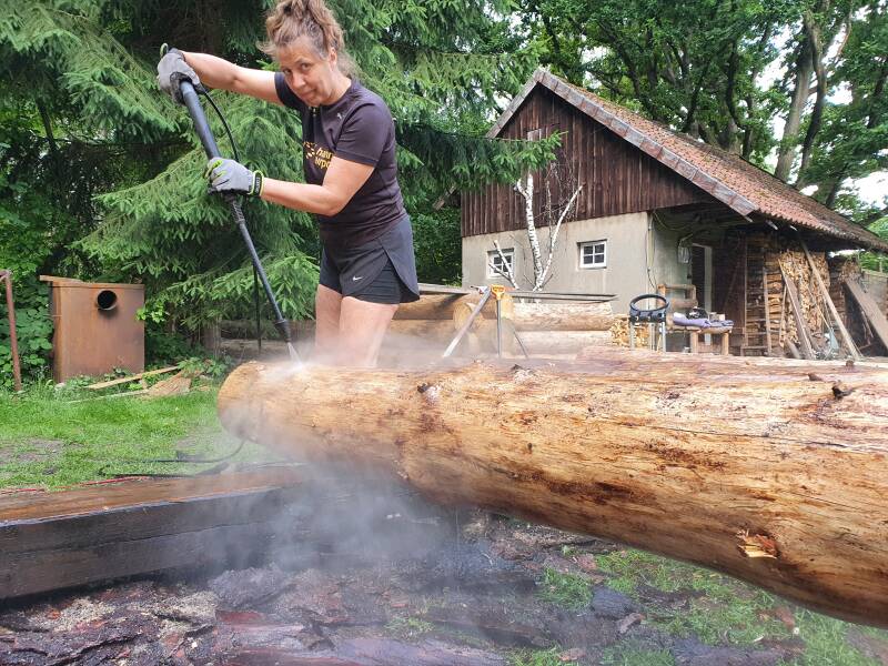 Vor der Verwendung der Stämme werden sie entrindet und mit hochdruck geputzt. Restliche Äste werden abgeschnitten.