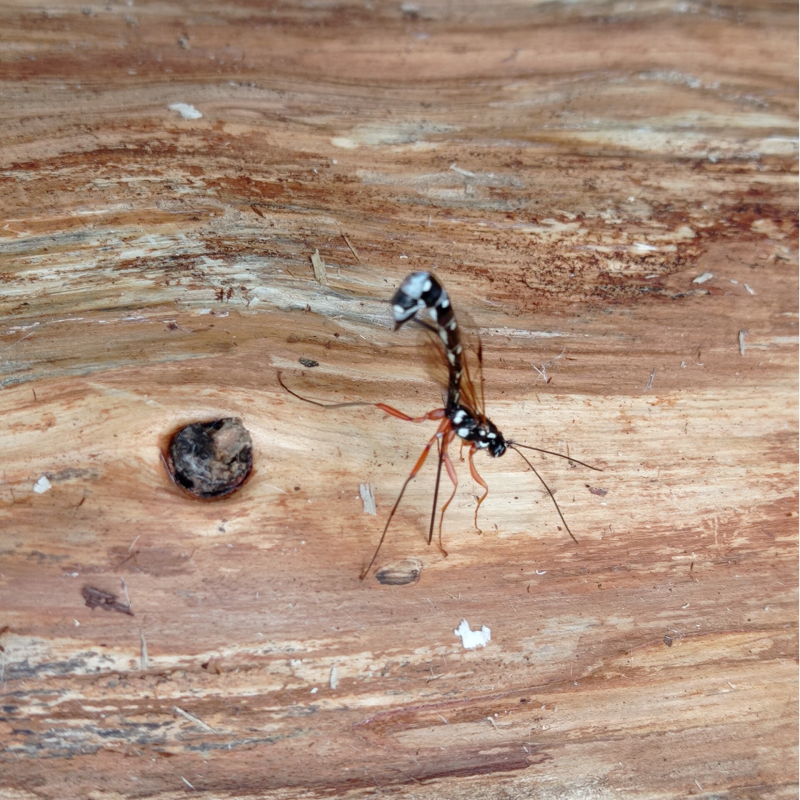 Eine Wespe versucht Eier zu legen, eine anders Insekt schlüpft nach 3 Jahren im Stamm. Beides wird durch Erhitzen (Sauna) des Holzes unterbrochen.