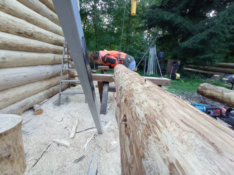 Unterkunft ist in diesem Fall eine Blockhütte mit Naturbelassen Stämmen. Die Stämme werden von Hand geerntet, auf Länge gesägt und zum Bauplatz in der Wedemark transportiert.